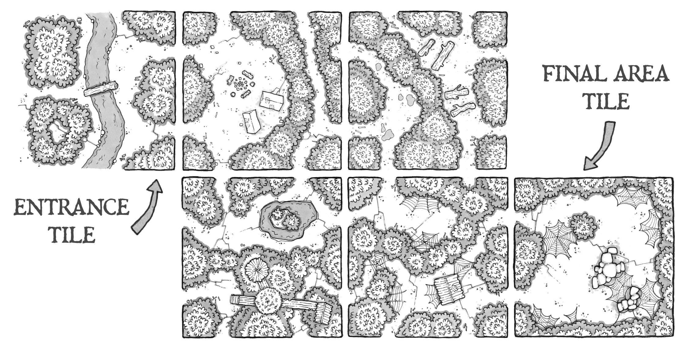 Twenty-six unique, lovingly-crafted, hand-drawn forest tiles that can be combined to provide endless configurations for your forest exploration!